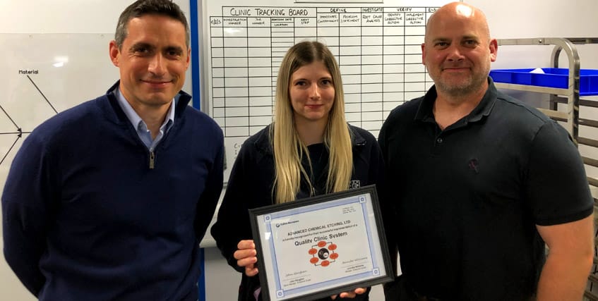 In May Advanced Chemical Etching were awarded an accreditation for the successful implementation of a quality clinic system by the international aerospace and defence firm Collins Aerospace.